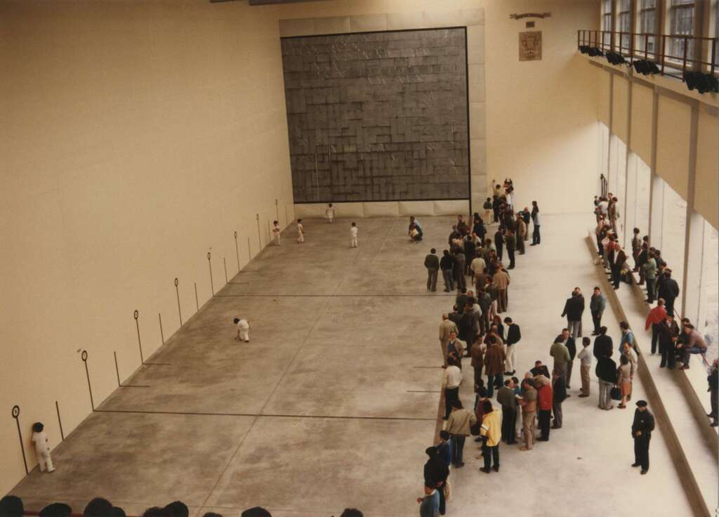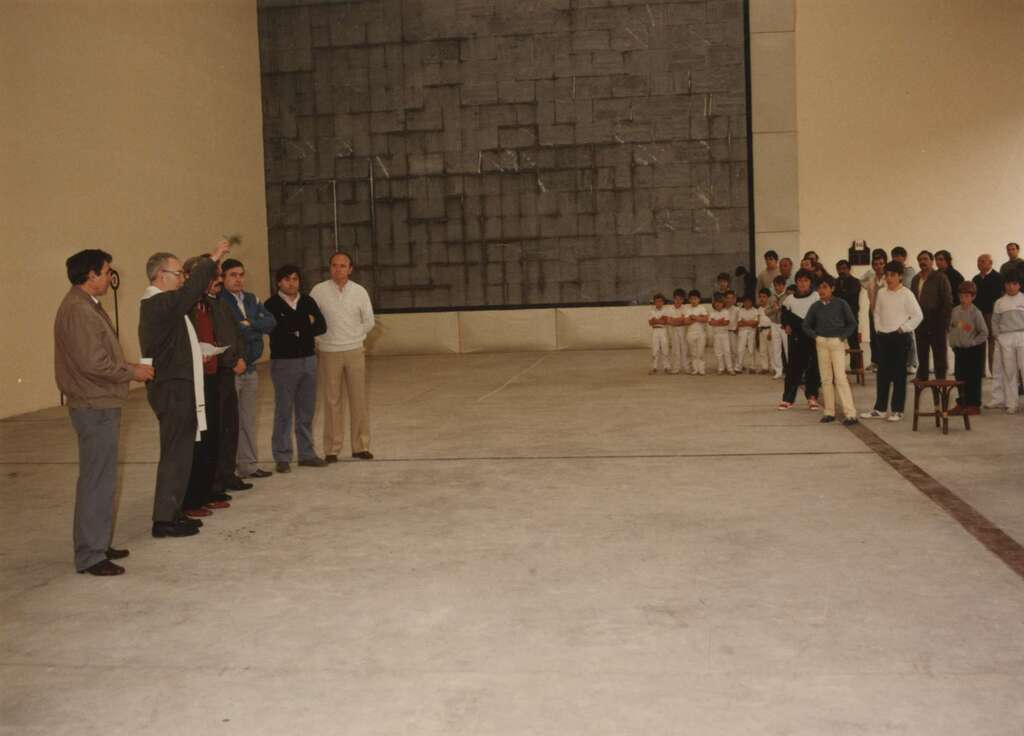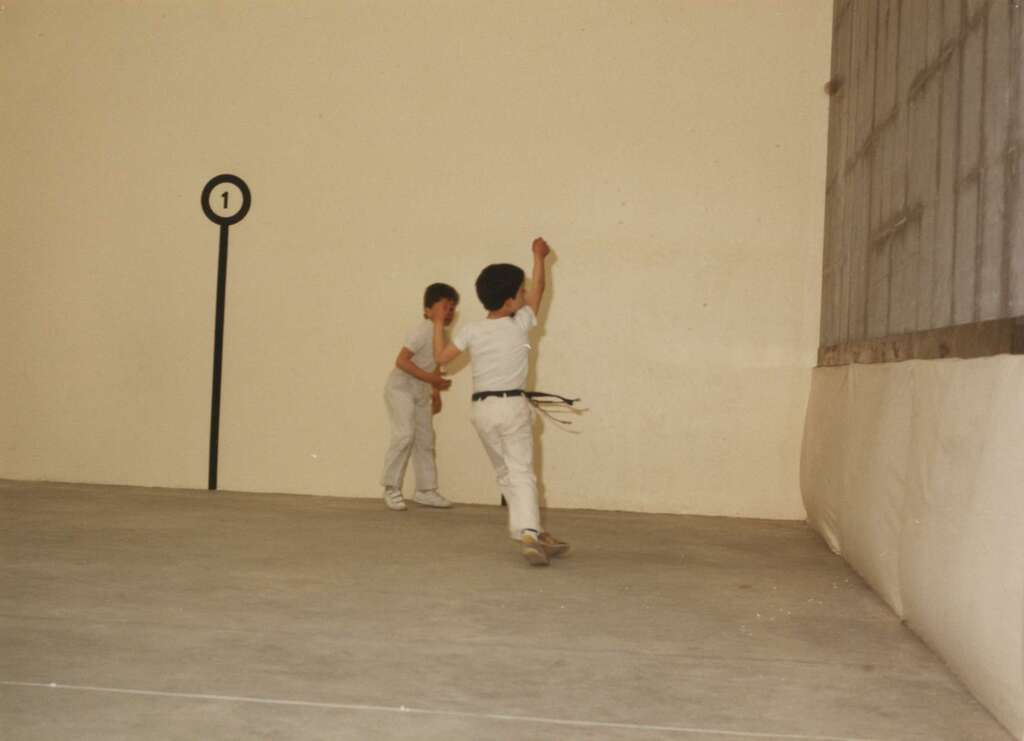 Niños jugando un partido de pelota para inaugurar el frontón cubierto