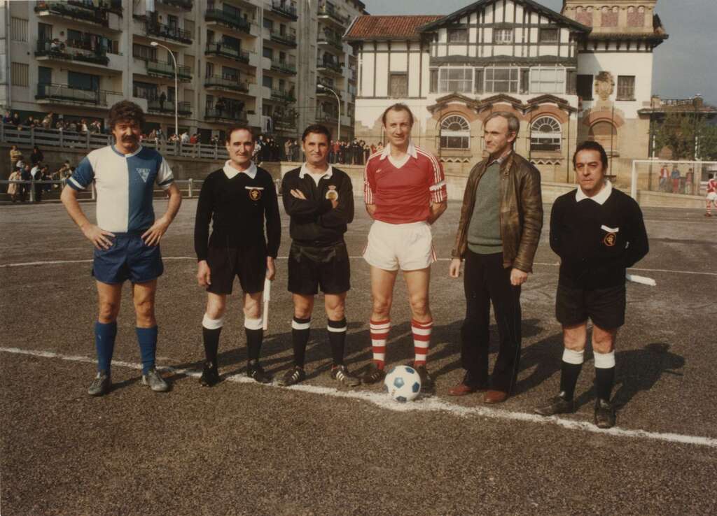 Uno de los dos equipos de fútbol que inauguró la zona deportiva y el trío arbitral