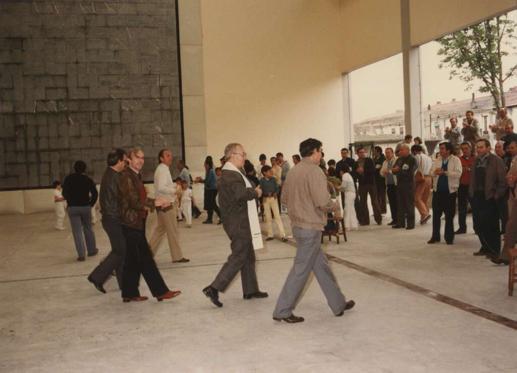 El párroco bendiciendo el frontón cubierto