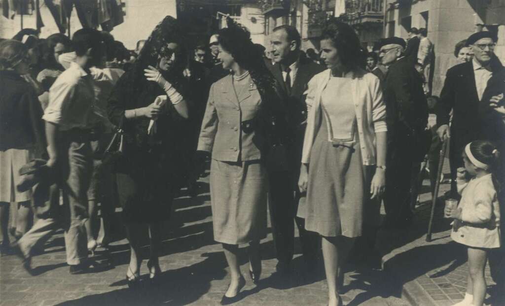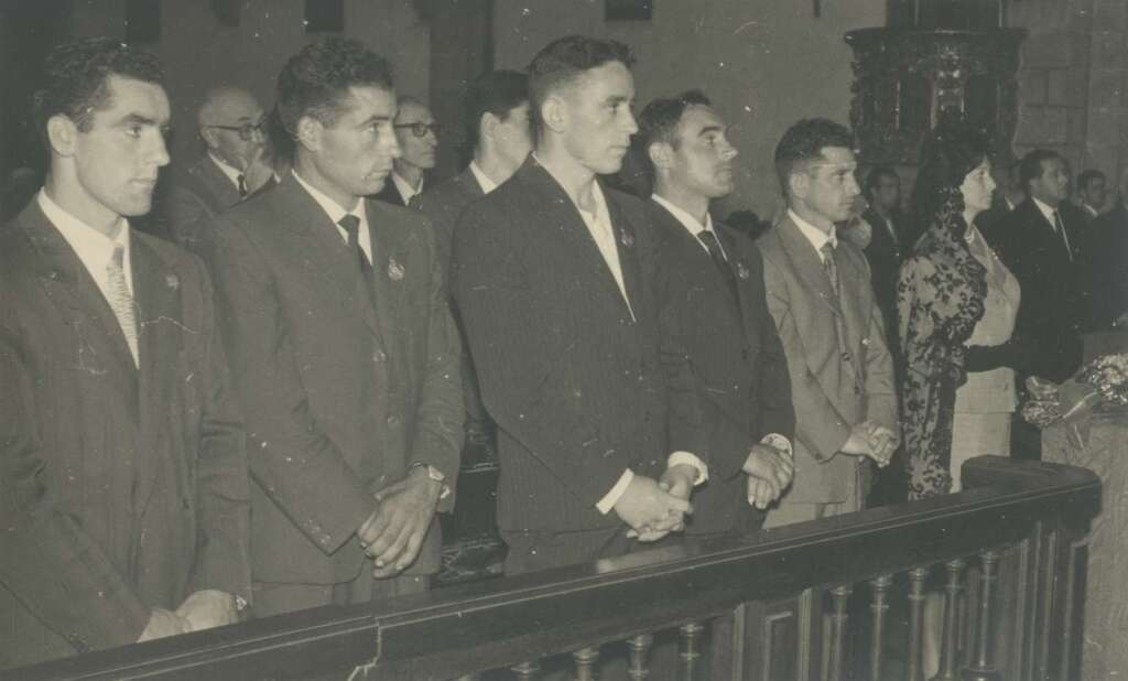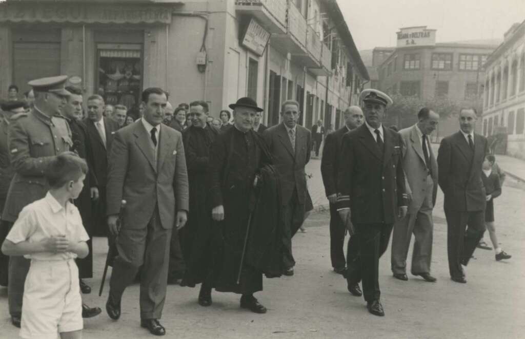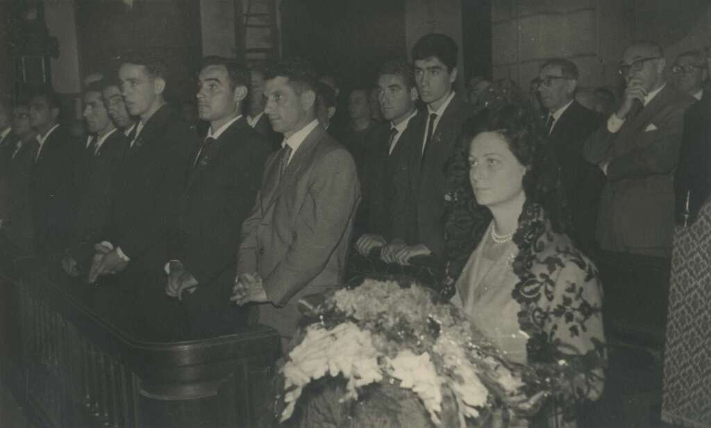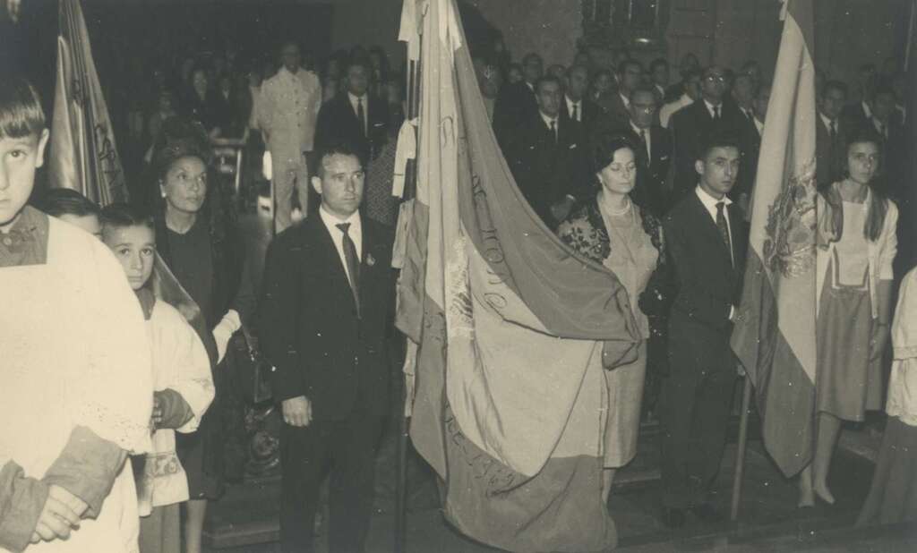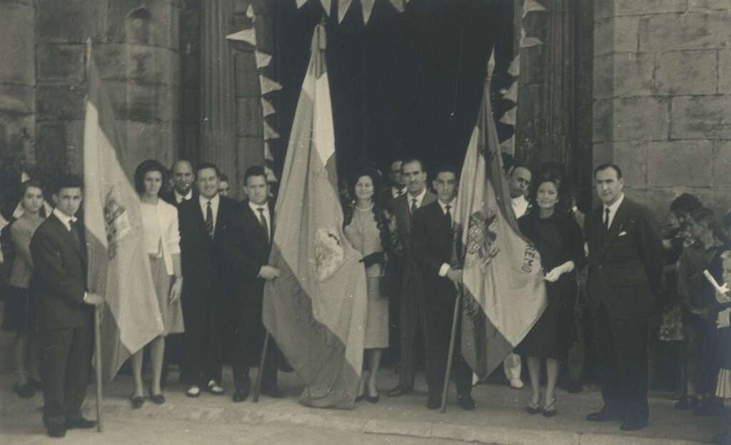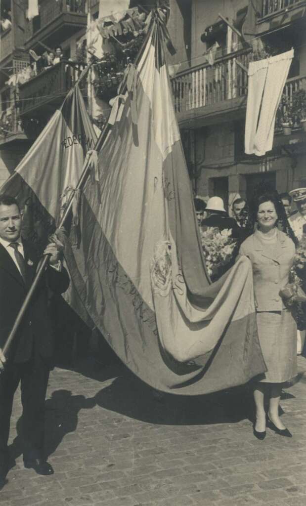 Momento de la salida de la iglesia San Juan Bautista. En ella posan con las tres banderas : Diputación, Pasaia y franquista