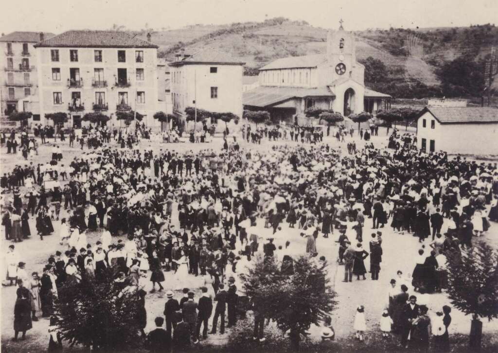 Fiestas en Pasai Antxo. Baile en una gran plaza, al fondo la iglesia San Fermín, la Tenencia de Alcaldía, y la casa nº 11 de la calle Zumalakarregi