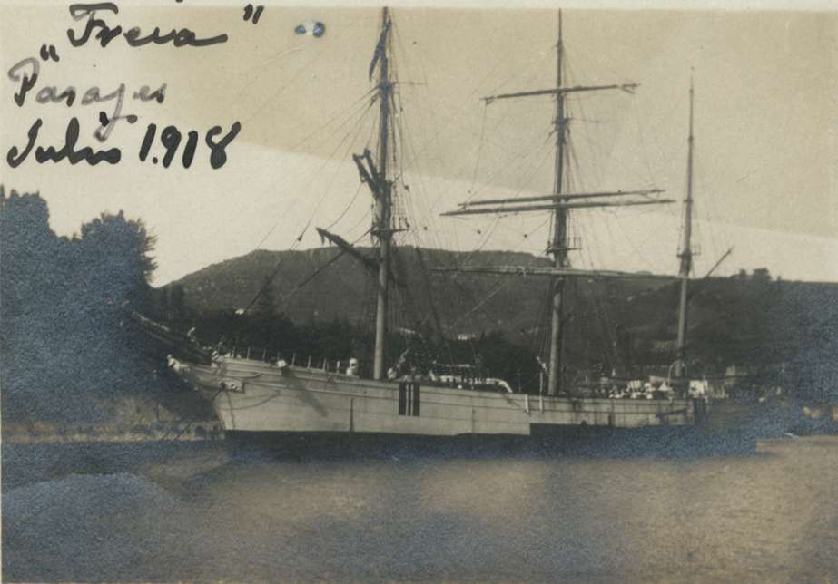 Barco atracado en el puerto de Pasai San Pedro. Al fondo, Jaizkibel